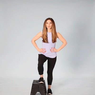Use a 4-6 inch step. Step up with one leg, bring your other leg to the step, then step down slowly. Do 3 sets of 12 reps each leg, 2-3 times weekly.