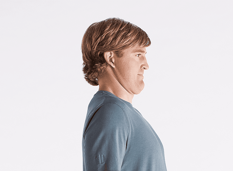 Tarik dagu ke belakang (bukan ke bawah!) sehingga kepala sejajar dengan tulang belakang, sampai dagu berganda. Pergerakan ini membantu membetulkan masalah kepala ke hadapan yang biasa dialami oleh pengguna telefon dan pekerja pejabat.
