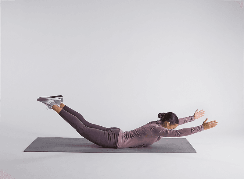Berbaring meniarap dengan tangan dilunjurkan ke depan. Angkat perlahan-lahan tangan, dada, dan kaki dari lantai, tahan 5–10 saat. Senaman ini menguatkan otot ekstensor tulang belakang, otot yang membantu anda mengekalkan posisi tegak.